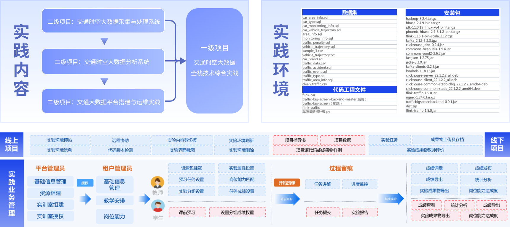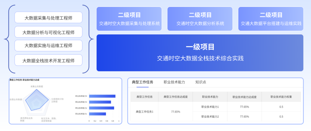 The design of practical tasks and content in the training lab is based on typical job tasks and professional technical competence requirements in the field of traffic big data. The training lab's platform can define knowledge and skill points for each practical task and provide data analysis and visualized reports on knowledge and skill points, professional technical competence, and job competency achievement based on the completion status of the practical tasks.