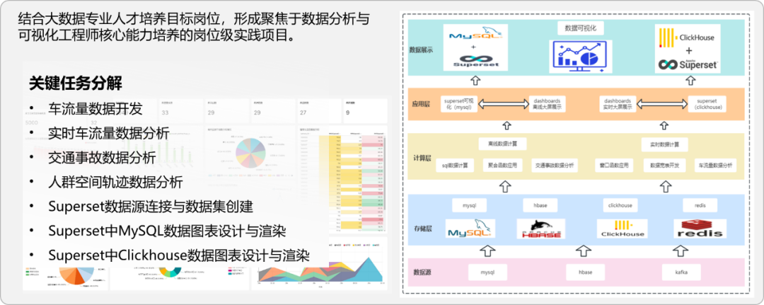The practice of trasportation big data analysis and visualization includes seven modules: development of traffic flow data, real-time analysis of traffic flow data, analysis of traffic accident data, analysis of crowd spatial trajectory data, data source connection and dataset creation, MySQL data chart design and rendering, ClickHouse data chart design and rendering. It covers data integration and correlation, MySQL data correlation analysis, Flink real-time stream processing and window functions, ClickHouse data storage, Python data analysis, and Superset data visualization display, and other relevant technologies.