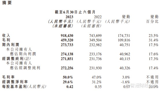 在截至2023年6月30日止六个月中,公司营收实现约9.18亿元(单位:人民币,下同),较去年同期增长23.5%;公司拥有人应占经调整纯利约2.72亿元,较去年同期增长17.4%。