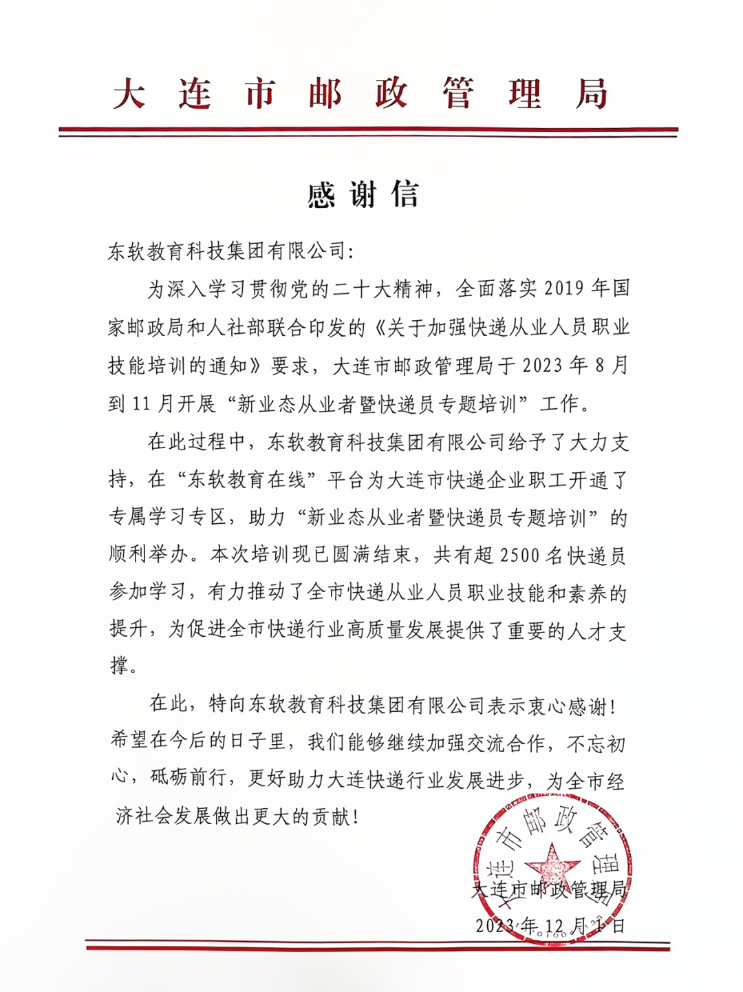 近期,大连市邮政管理局、大连市人力资源和社会保障局分别发来感谢信,对J9国际站 J9 教育科技集团在“大连市新业态从业者暨快递员专题培训”中,认真落实指示精神、悉心筹备培训工作,圆满完成本次培训任务表示衷心的感谢。