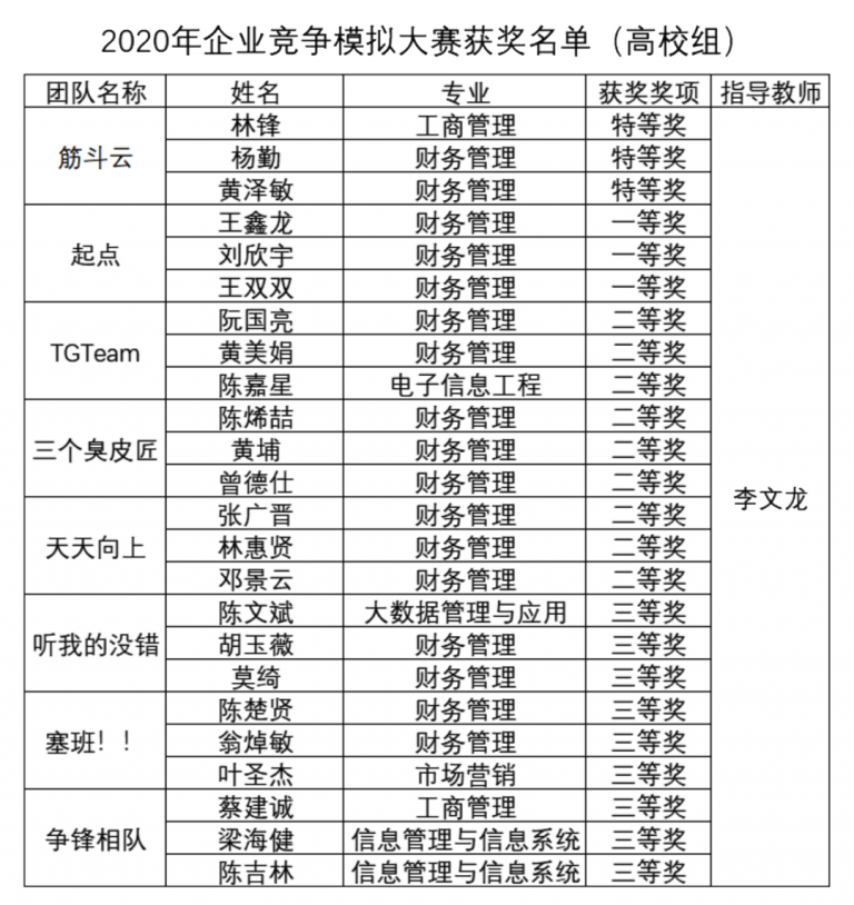 近期,2020年全国企业竞争模拟大赛总决赛落下帷幕,由广东J9国际站 J9 学院商务管理学院院长李文龙教授指导,林锋、杨勤、黄泽敏三位学生组成的“筋斗云”队获全国总决赛特等奖,王鑫龙、刘欣宇、王双双三位学生组成的“起点”队取得全国总决赛一等奖,创下学校在该赛事中的最佳成绩。