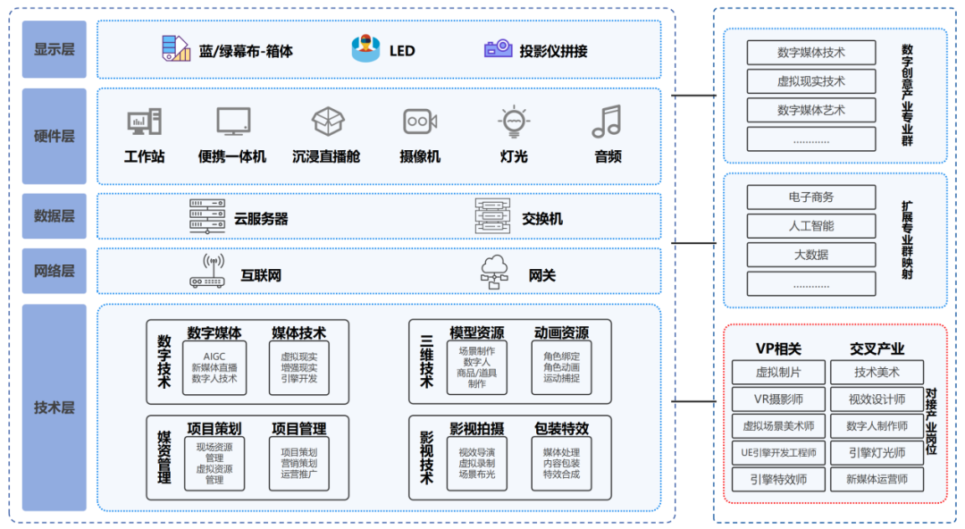 基于数字媒体产业及数字媒体大类专业和专业群,虚拟演播实验/实训室的实践体系,以虚拟演播全流程岗位核心技能训练为重点,涵盖从虚拟导播、VR拍摄、虚拟资产创造到UE引擎开发等核心能力的培养与实战训练。此体系旨在为数字媒体技术、虚拟现实技术及相关数字媒体专业的智能媒体人才,搭建一个全面的实践教学平台,并配备丰富的配套资源,以促进其专业技能的深度开展与创新应用能力的提升。