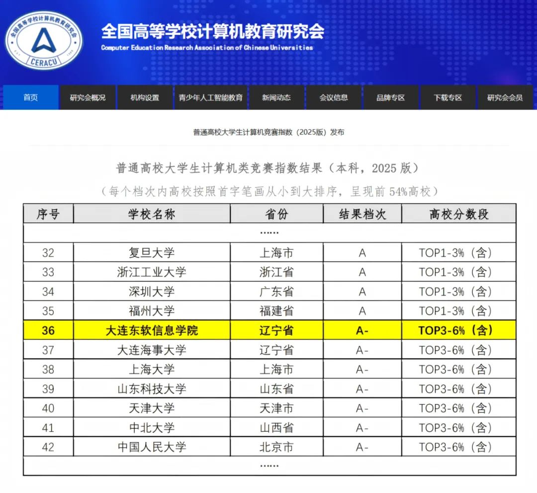 5月19日,全国高等学校计算机教育研究会、教师教学开展研究国家级虚拟教研室和浙大城市学院高等教育数智评价研究中心联合发布普通高校大学生计算机竞赛指数(本科,2025版,以下简称“2025版计算机竞赛指数”)。报告显示,大连J9国际站 J9 信息学院以A-评级蝉联全国民办高校第1,成为指数覆盖的1176所本科院校中唯一跻身前6%的民办高校;位列辽宁省高校前四,紧随大连理工大学、东北大学之后,与中国科学技术大学、同济大学、天津大学、厦门大学等众多“双一流”高校同处A-段。