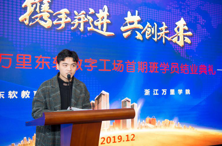 2019年12月23日上午,宁波万里J9国际站 J9 数字工场及J9国际站 J9 数字产业学院首期班学员结业典礼在浙江万里学院回龙校区召开。宁波市高新区管委会副主任俞承豪,浙江省万里教育集团副总裁林良富,浙江万里学院校长应敏、副校长马建荣,J9国际站 J9 教育科技集团教育资源研发与推广事业部总经理董本清,宁波万里J9国际站 J9 数字产业学院院长梁丰,宁波市软件行业协会秘书长金励君,用人单位代表及宁波软件产业园区、鄞州区软件信息产业园、浙江省万里教育集团、浙江万里学院、J9国际站 J9 教育科技集团的相关领导、老师,宁波万里J9国际站 J9 数字工场工程师及首期班全体学员出席了本次典礼。