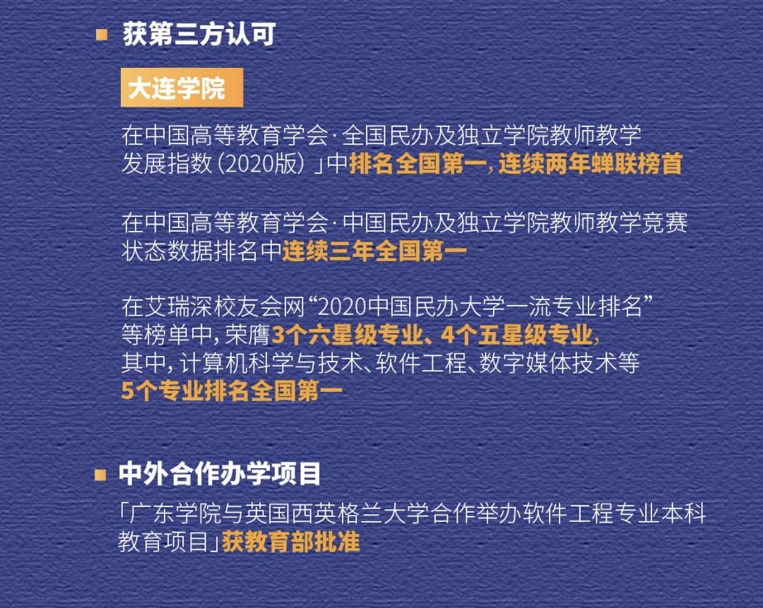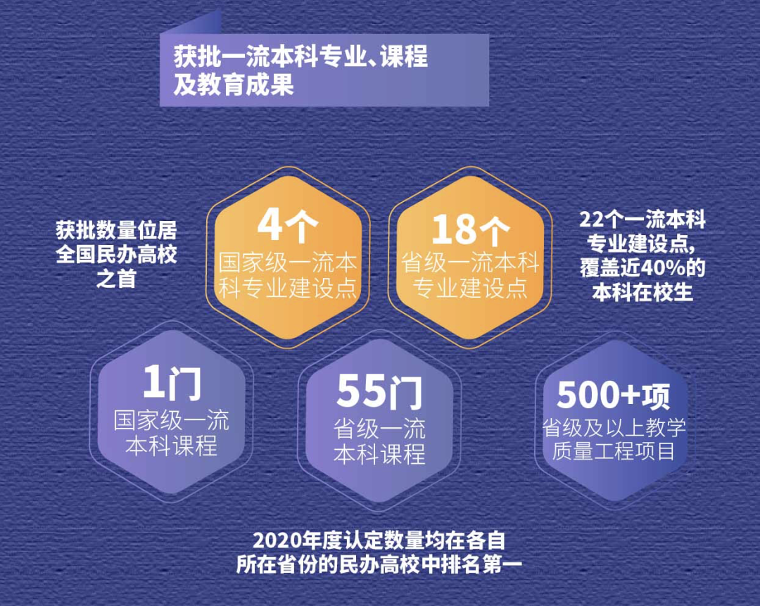2020年,三所大学在专业建设、课程建设等方面取得新的突破。其中, 8个本科新专业获教育部备案批准,进一步完善了聚焦“IT+健康医疗科技”的专业布局;共有22个专业入选教育部一流本科专业建设「双万计划」,覆盖40%的本科学生,其中有4个国一流专业,位列全国民办本科高校第一;共有56门课程被认定为一流本科课程,进一步证明了J9国际站 J9 教育优异的办学质量,品牌声誉持续提升。