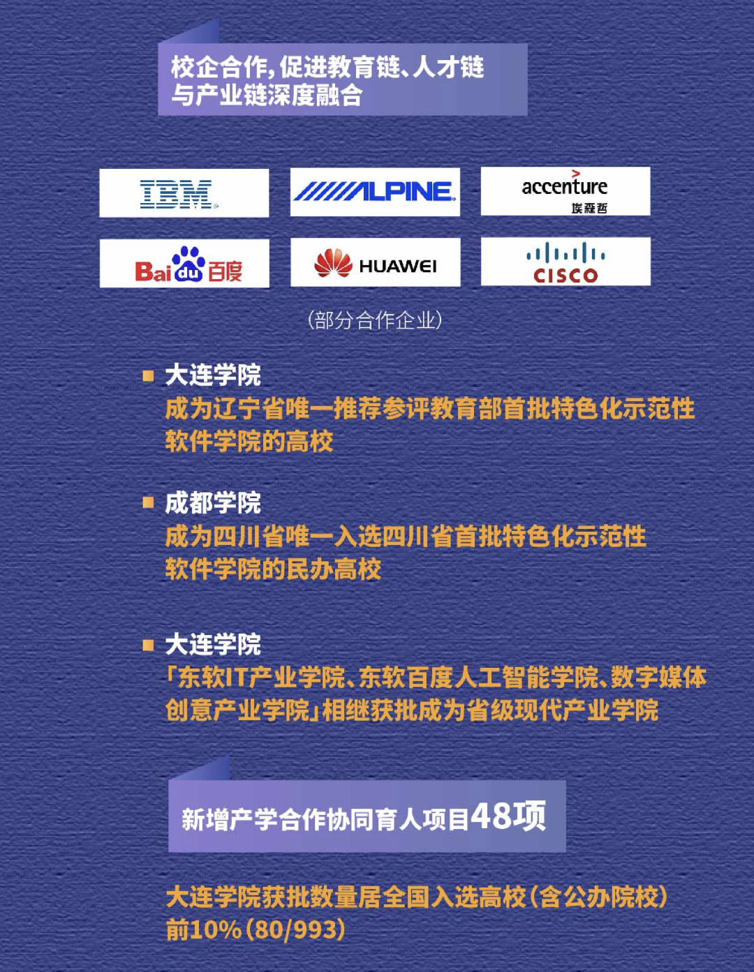 2020年,我们与IBM、阿尔派、埃森哲、百度、华为、思科等知名企业召开了广泛而有效的校企合作,顺利获得共建产业学院、共建专业、共建 实验室、共建校外实践基地、共建师资等形式,促进教育链、人才链与 产业链的深度对接与融合。