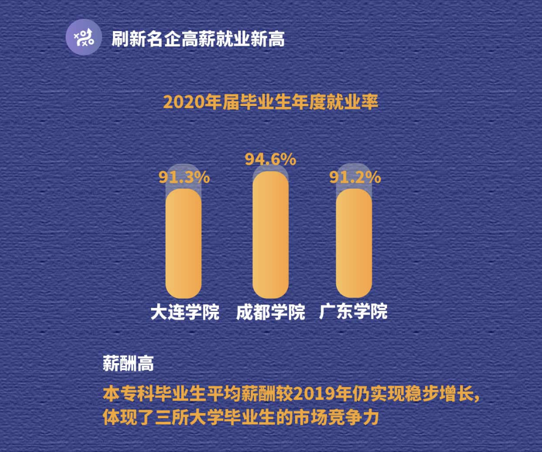 截至2020年12月31日,三所大学2020届毕业生年度就业率分别为91.3%、94.6%、91.2%,高于所在省份普通高校就业率平均水平。在疫情影响就业市场的环境下,2020届本、专科毕业生平均薪酬较2019年仍实现了稳步增长,众多毕业生就职于IBM、网易、腾讯、京东、联想、松下、字节跳动等知名企业,体现了三所大学毕业生的市场竞争力。