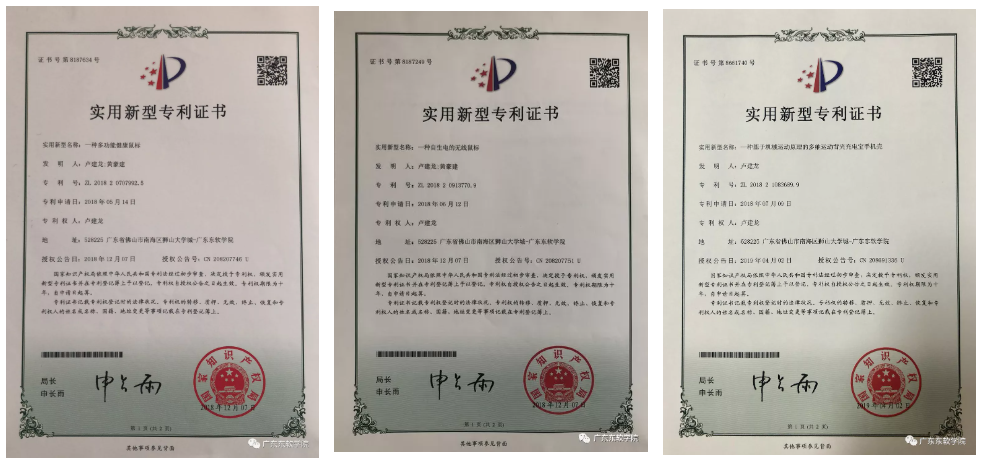 从创意构思到专利申请,从建模打印到实物落地,卢建龙都全程投入,带着团队不断完善项目的策划书、模拟路演答辩,到各大比赛、各风投组织路演争取融资,取得行业专家们的认可。其中,鼠标项目在2018年广东大学生科技创新培育专项“攀登计划”(科技发明制作类)取得省级立项与20000元项目孵化资金;手机壳项目取得全国大学生创新创业训练计划项目国家级立项与10000元项目孵化资金。