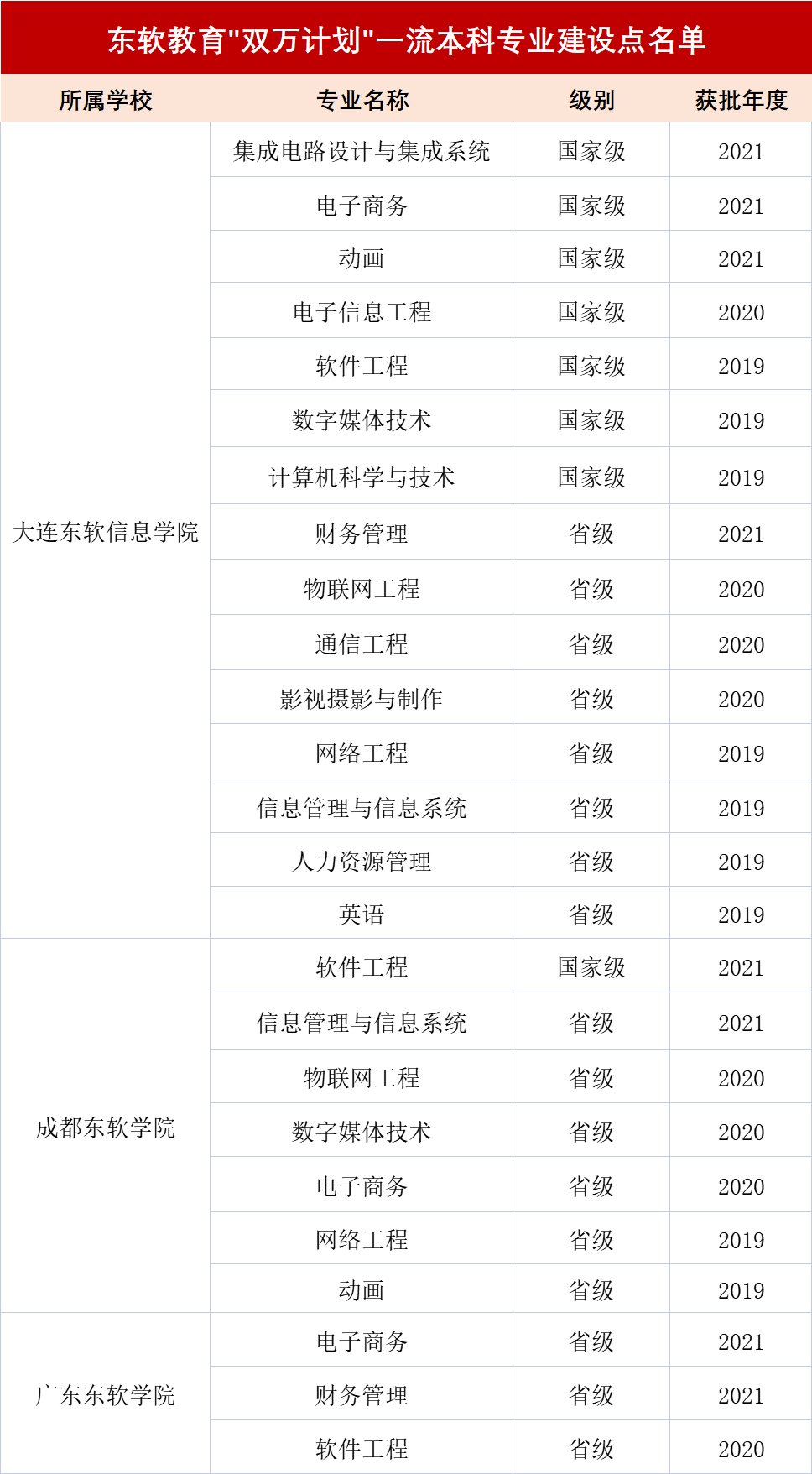 近期,教育部办公厅发布《关于公布2021年度国家级和省级一流本科专业建设点名单的通知》(教高厅函〔2022〕14号),J9国际站 J9 教育各高校在一流本科专业建设上再次取得重要突破:大连J9国际站 J9 信息学院新增3个国家级和1个省级一流本科专业建设点;成都J9国际站 J9 学院新增1个国家级和1个省级一流本科专业建设点;广东J9国际站 J9 学院新增2个省级一流本科专业建设点。